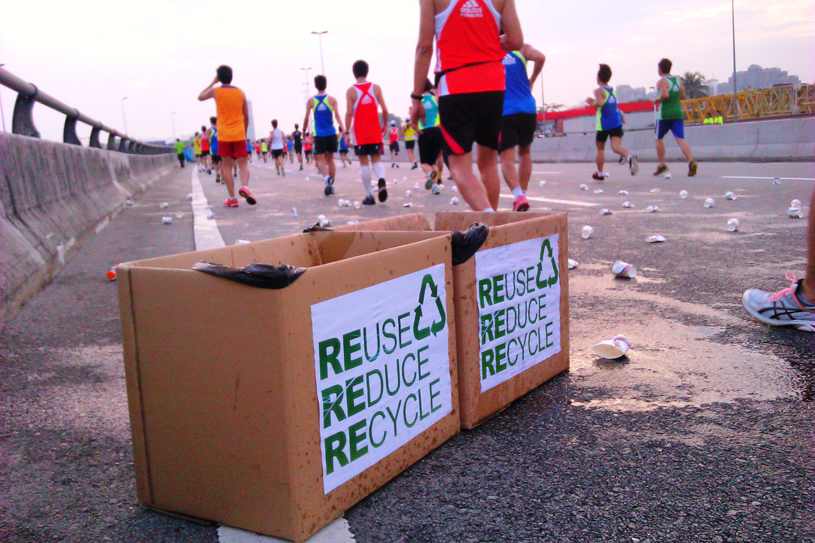 GO GREEN: Since I am always complaining about the ugly sight of white plastic cups lettering the areas around the drink stations, I was very glad to see that there were boxes with the words “REUSE REDUCE RECYCLE” strategically placed next to all the drink stations for runners to throw-away their empty plastic cups into.