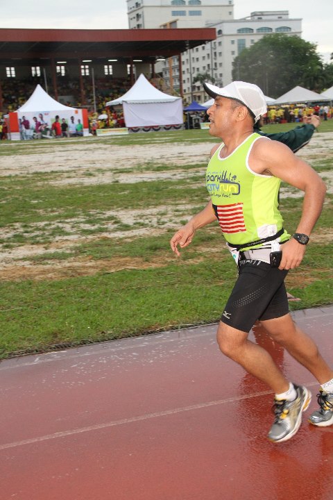There were some nice elevations during the main run, and soon after we had U-turned at the midway point, there was a drink station waiting for us. In total, there were 3 drink stations along the route, and as far as I know there was enough water & 100plus for all runners. Strangely, after the halfway mark, the urge to relieve myself had disappeared and I could increase my pace, and I even managed to past some slower runners ahead. I did make it a point to shout, “Come on, you can do it”, to the last runners who were running in the opposite direction. During the last third leg of the race, I saw a young boy walking in his soaking-wet socks holding his shoes: I asked him, “Are you alright?” He was too tired to reply me so I told him, “Take it easy and enjoy the run”. After a steep incline to the last drink station, my pace picked-up knowing that the finishing line was nearing soon. As I approached the stadium, I met my friends Dodo & YS Lee who had already finished the race. I stopped to pose for some photos with them, before legging it into the stadium and cross the finish line.