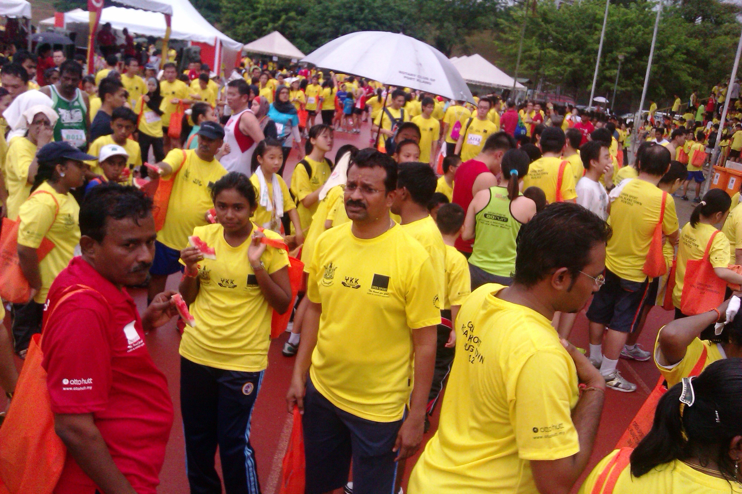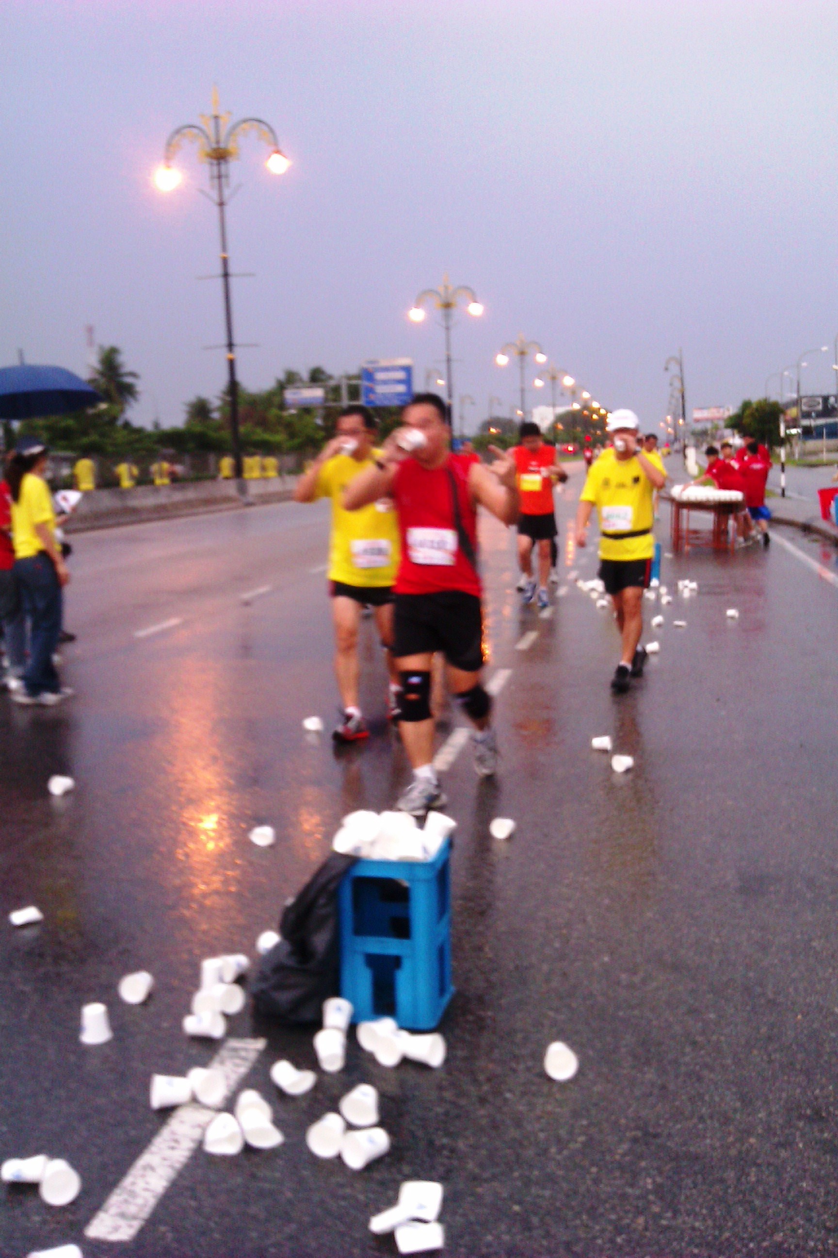 On the race day itself, the participants, proudly adorned in their new yellow shirts, gathered at the Sulaiman Stadium. There were several white tents pitched near the grandstand for trophies, goodie bags, refreshments, VIPs, and luggage storage. To my despair, there were long queues for the toilets in the stadium and the portable ones too. Anyway, there were many participants sitting in the grandstand, and some were either loitering, stretching & warming-up on the nice stadium track. Around 6:30am, the grey skies opened-up and the rain started pouring. Many runners found shelter from the rain in the grandstands, and some others like me decided to brave the cooling rain by dancing to the moves and music of a Fitness First instructor. Soon after the 12km runners were asked to assemble at the start line outside the stadium, and we promptly left behind the 5.5km runners to wait their turn. As we huddled together in the rain, impatiently waiting for the start, the VIPs arrived with their blare-horns. After a 15 minutes delay, we were flagged-off at 7am. Many happy feet followed the route which lead them past an upmarket residential area before heading on the main road heading towards Pandamaran. The road was nice and straight, and I had to stop myself from diving into one of the petrol stations to relieve myself as I did not want to risk losing-out on a medal later.
