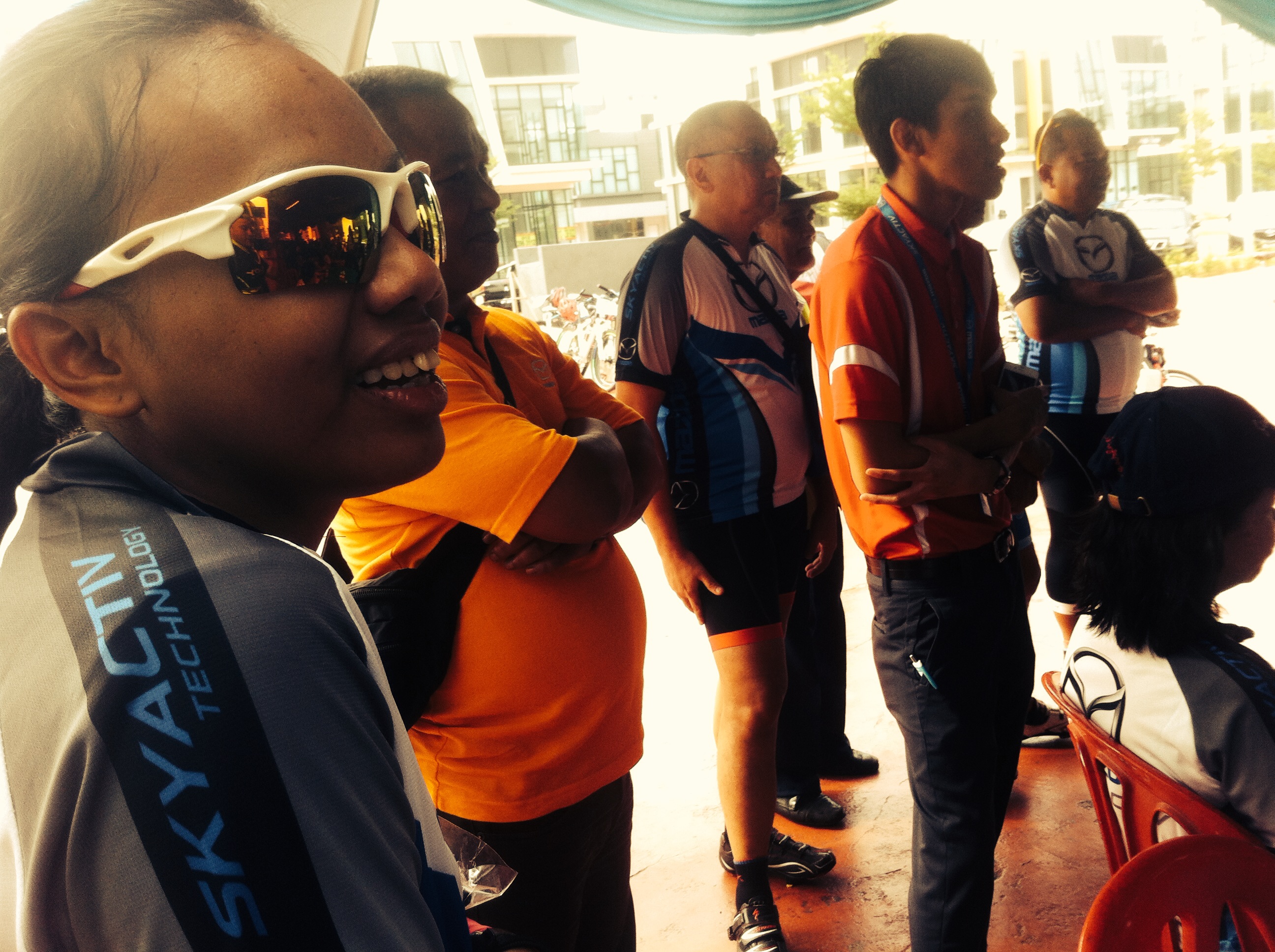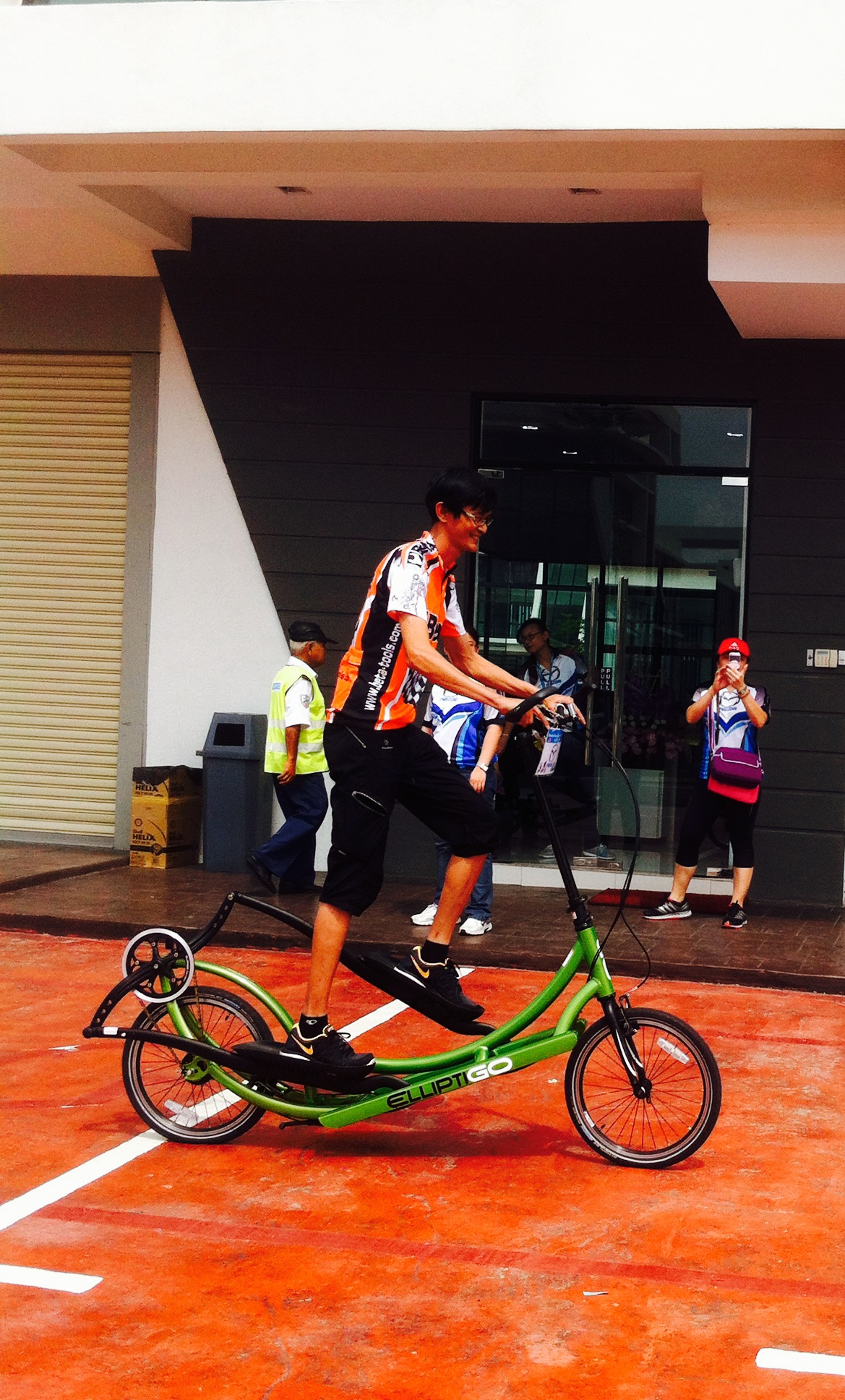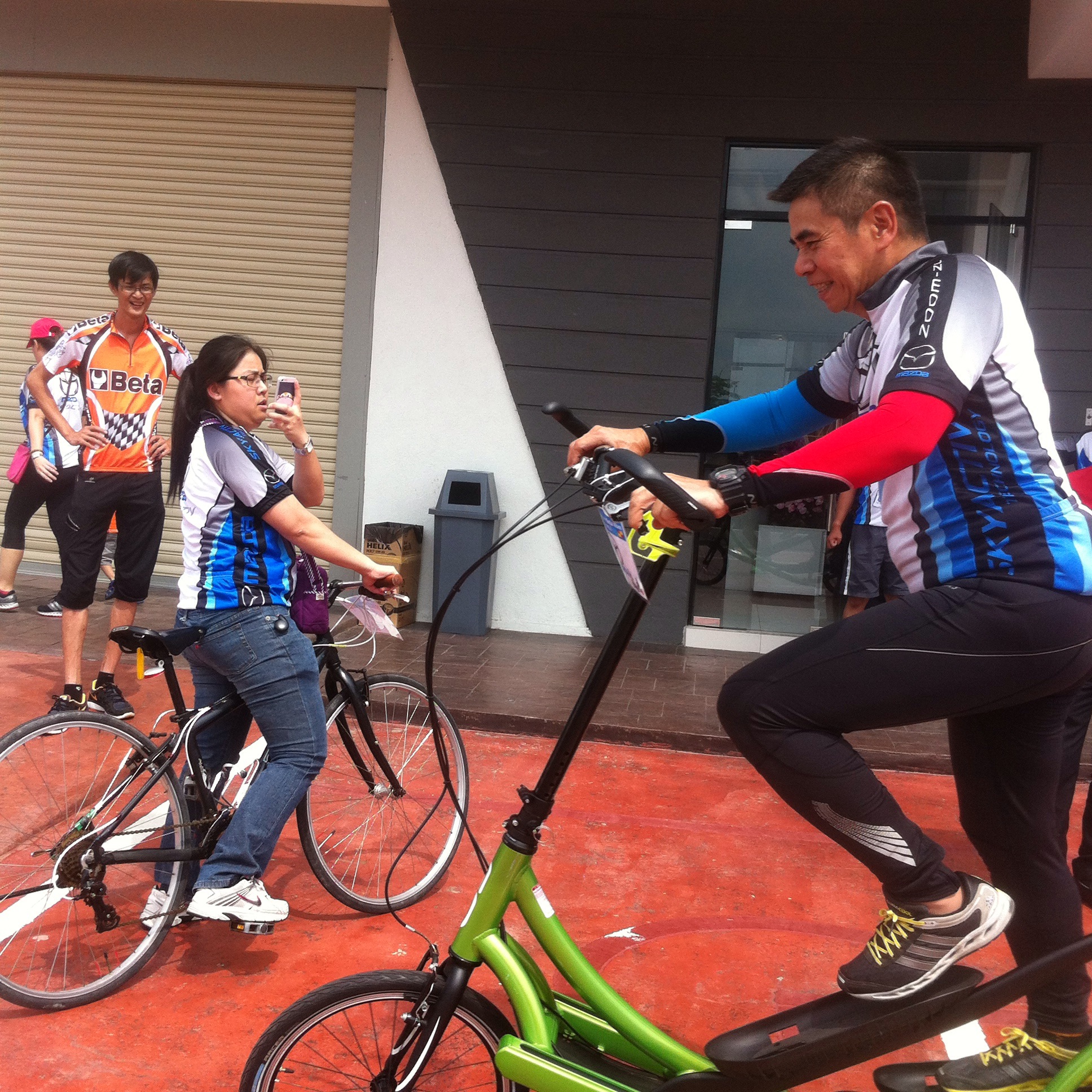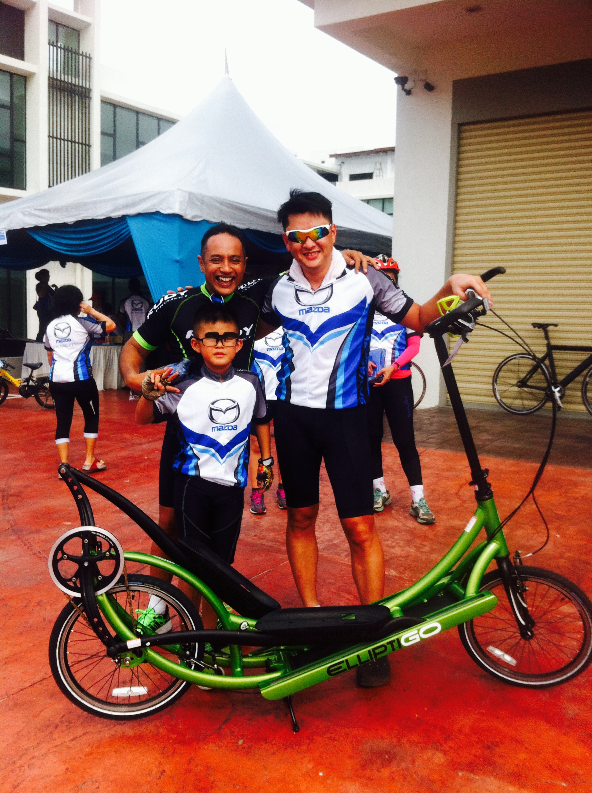 At approximately 8am, the riders were flagged-off and we followed behind the lead safety car. There was an ambulance & traffic police present to ensure riders’s safety was well managed. At the halfway point, we stopped for a drink and to regroup. Soon after, we headed back to the finishing line where we checked-out to receive our door gifts. Then, our master-of-ceremony, David Chan, presented the lucky draw prizes of mugs, tumblers, caps, passport holders, vouchers for Starbucks & Kenny Rogers Chicken, and the grand prize was a made-in-Italy cycling helmet sponsored by BETA Tools. Afterwards, buffet lunch of fried chicken, sweet and sour fish, stir-fried vegetables, salad, fried rice and fresh fruits was served to cap-off a wonderful morning. Several Mazda staff test rode my ElliptiGo bicycle because they were curious to find-out how to balance and ride it standing-up. All managed to ride without falling. Their gleeful faces looked like kids who learnt to ride a bike for the first time.