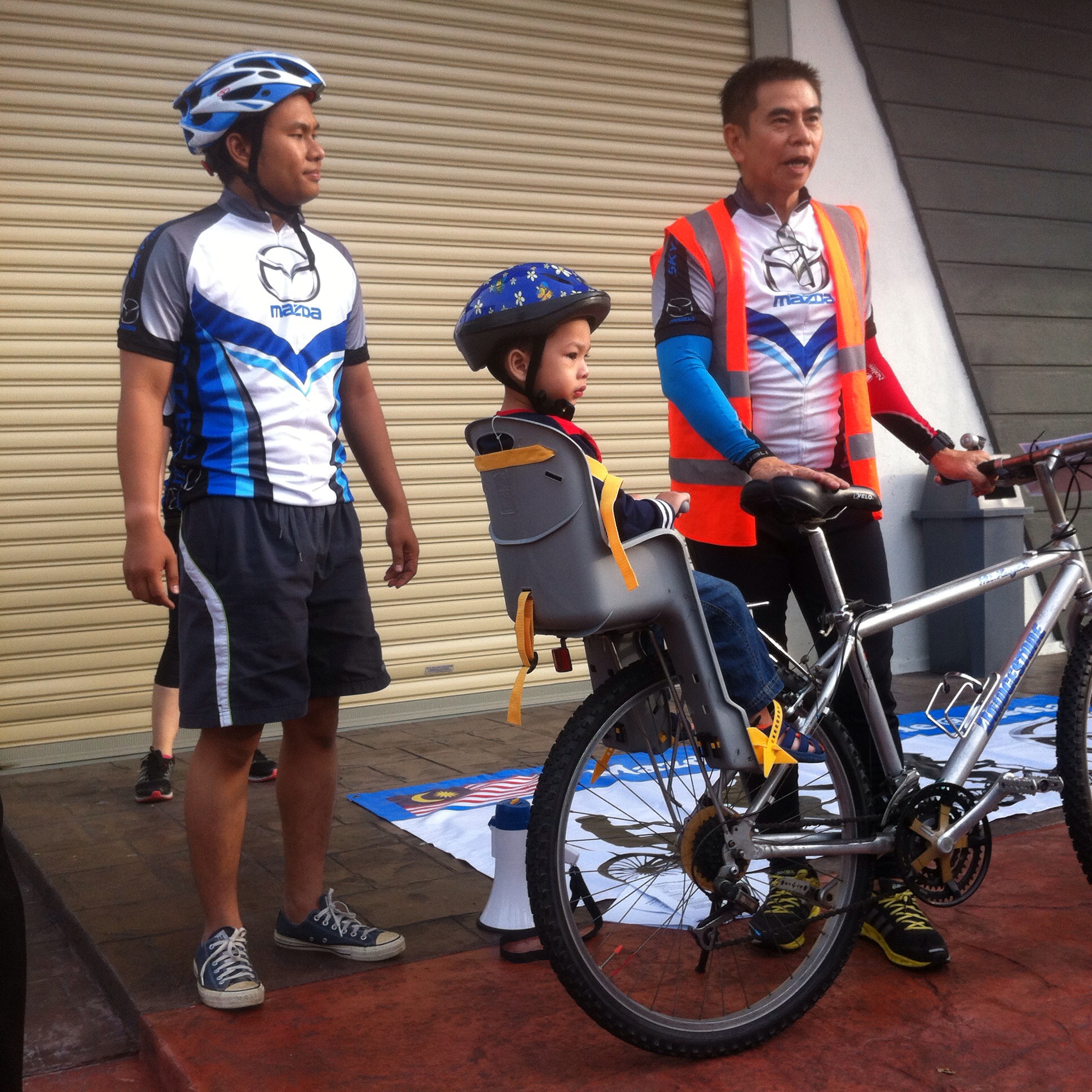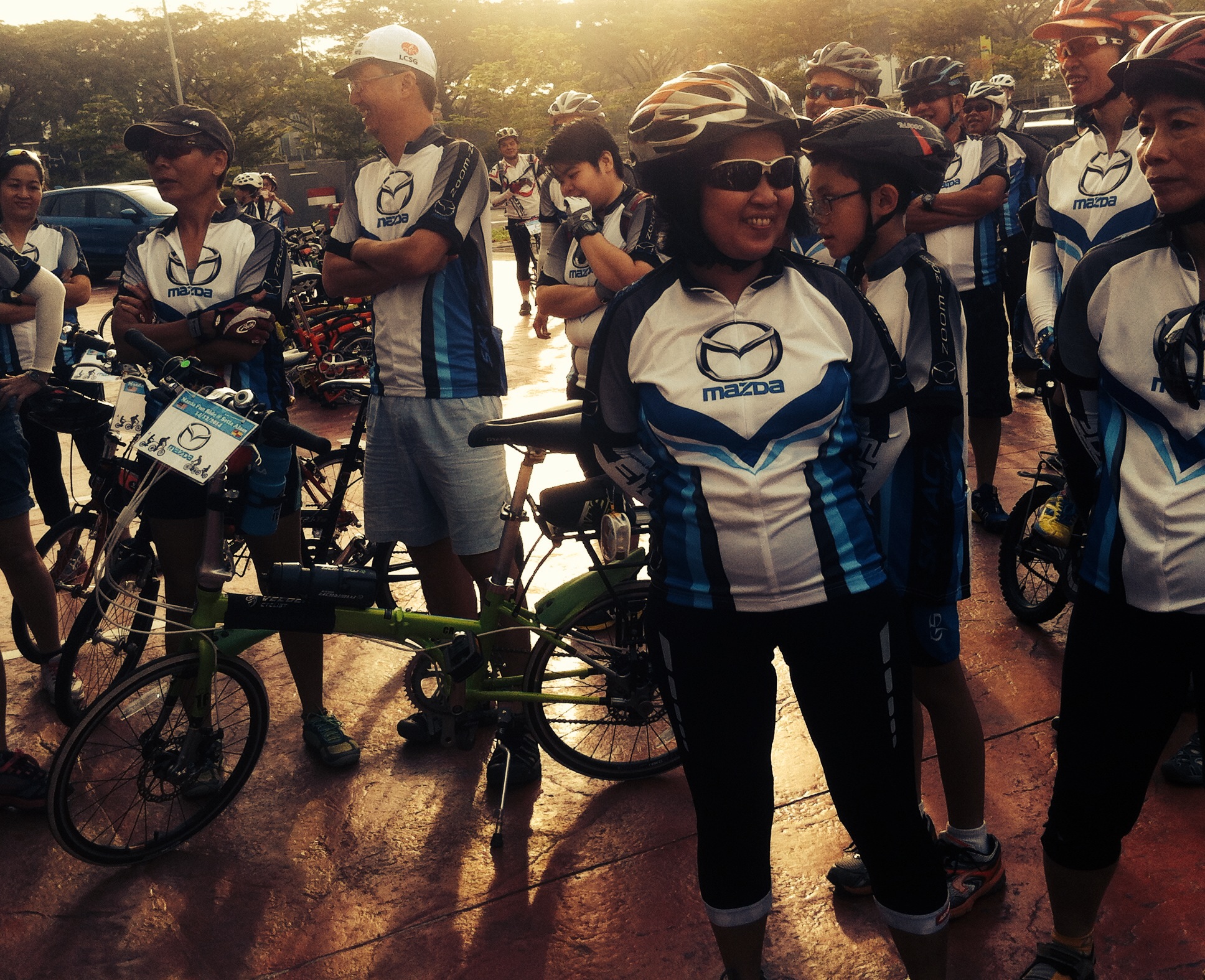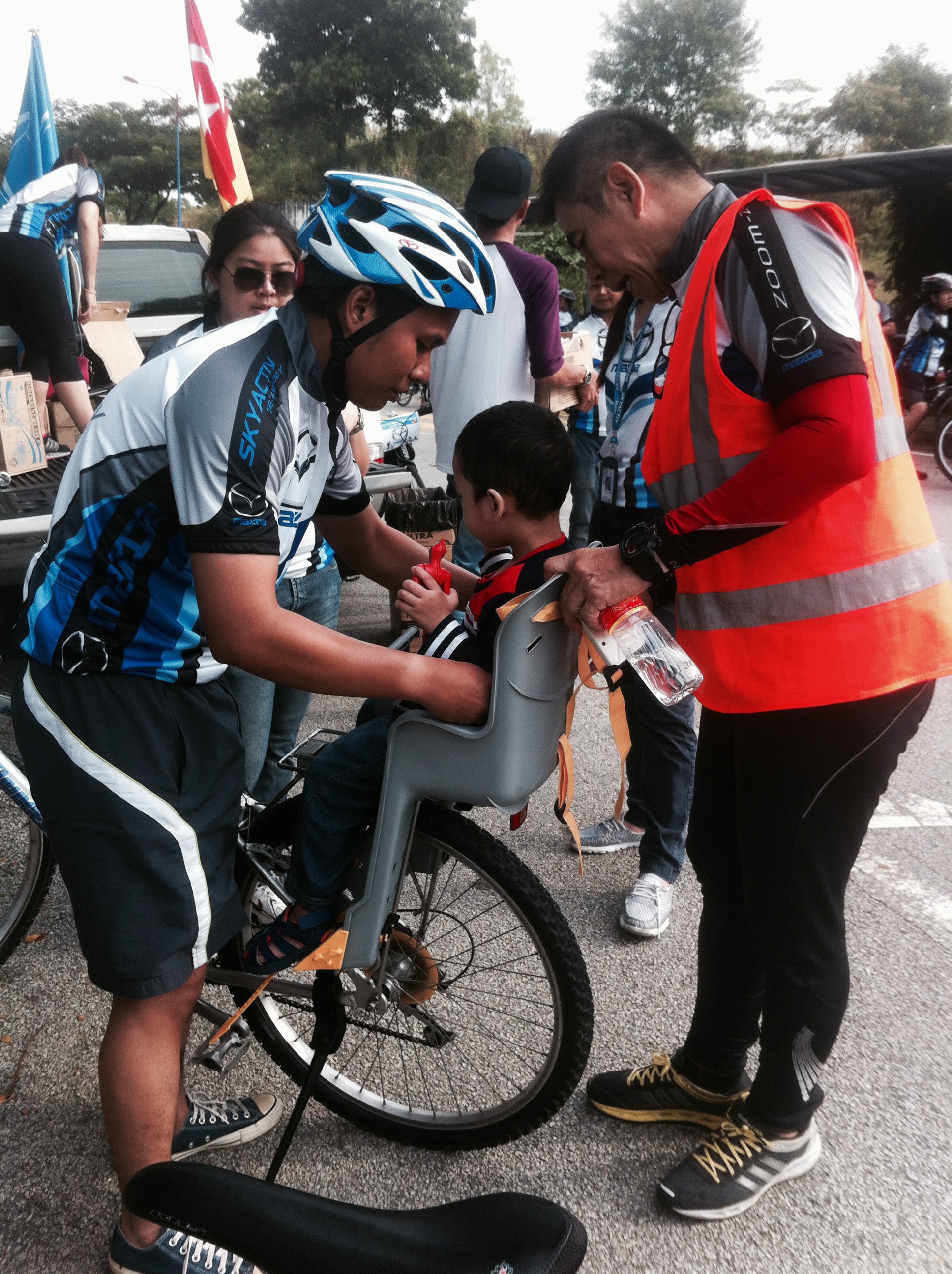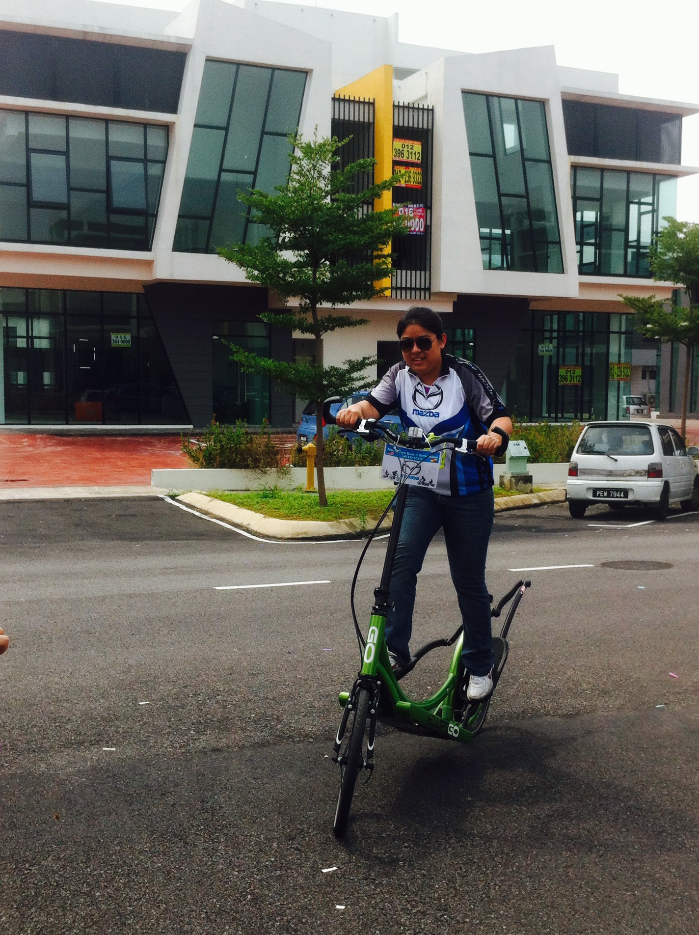 At approximately 8am, the riders were flagged-off and we followed behind the lead safety car. There was an ambulance & traffic police present to ensure riders’s safety was well managed. At the halfway point, we stopped for a drink and to regroup. Soon after, we headed back to the finishing line where we checked-out to receive our door gifts. Then, our master-of-ceremony, David Chan, presented the lucky draw prizes of mugs, tumblers, caps, passport holders, vouchers for Starbucks & Kenny Rogers Chicken, and the grand prize was a made-in-Italy cycling helmet sponsored by BETA Tools. Afterwards, buffet lunch of fried chicken, sweet and sour fish, stir-fried vegetables, salad, fried rice and fresh fruits was served to cap-off a wonderful morning. Several Mazda staff test rode my ElliptiGo bicycle because they were curious to find-out how to balance and ride it standing-up. All managed to ride without falling. Their gleeful faces looked like kids who learnt to ride a bike for the first time.