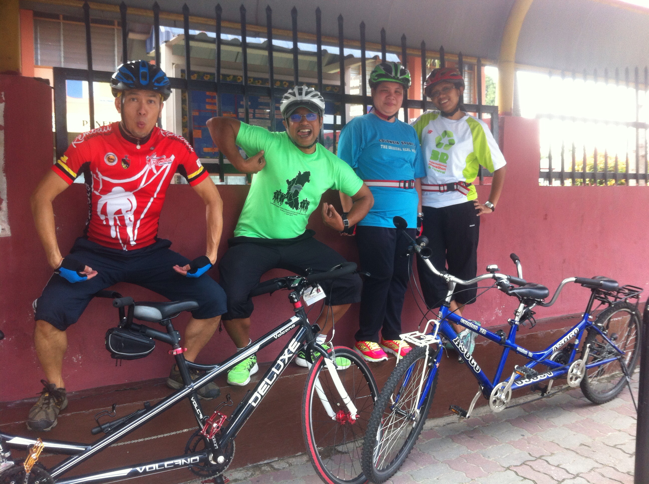 While waiting for Jeffrey & Evon, Eddy & Gus rode one loop on the fast & furious Black Horse tandem. It was the first time for Gus to navigate a blind rider, besides Steven. Eddy explained the role of the navigator & pillion rider to Gus. Gus practiced shifting gears to give a more effortless ride under different elevation. Gus also noticed how important it was to have a pillion rider who is well-balanced to prevent the tandem from slipping sideways. Another important advice from Eddy was to not slow down for bumps & potholes. Instead, the navigator must ride straight through these obstacles as the long wheel base of the tandem can withstand such impact. Before the impact, the navigator must warn the pillion to brace himself & grip handle tighter to steady the bike. We must not swerving suddenly to avoid obstacles because this will cause both riders to lose balance & fall. After my ride with Eddy, I realised what a truly accomplished tandem rider he was, and I know that he has put in a lot of effort on his trainer at home to be a stronger rider.