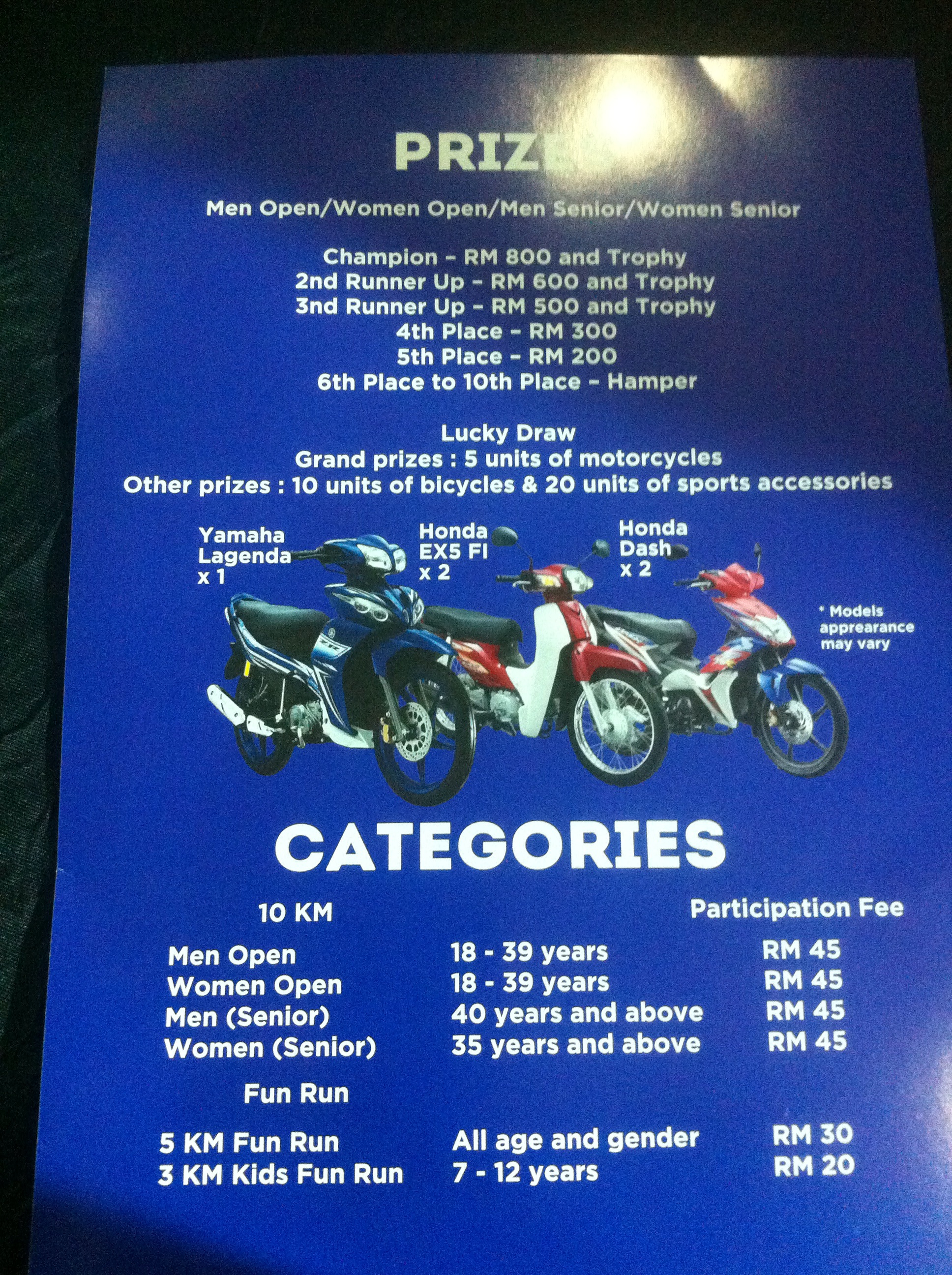 The expected total number of participants is a whopping 5,000, and race technical organiser is the relatively new outfit comprising of the hardworking trio, Bukhari, Omar & Amirudin who are collectively known as the Running Project. There are almost RM10,000 cash prize plus trophies & hampers for the 12km winners. The Grand Prizes for the lucky draw will be 5 units of Honda & Kawasaki motorcycles – what a mouthwatering prospect! The race fees are RM45 for 10km, RM30 for 5km & RM20 for 3km. Registration is open to Malaysians & Foreigners Residing In Malaysia. For registration & more event details, click HERE