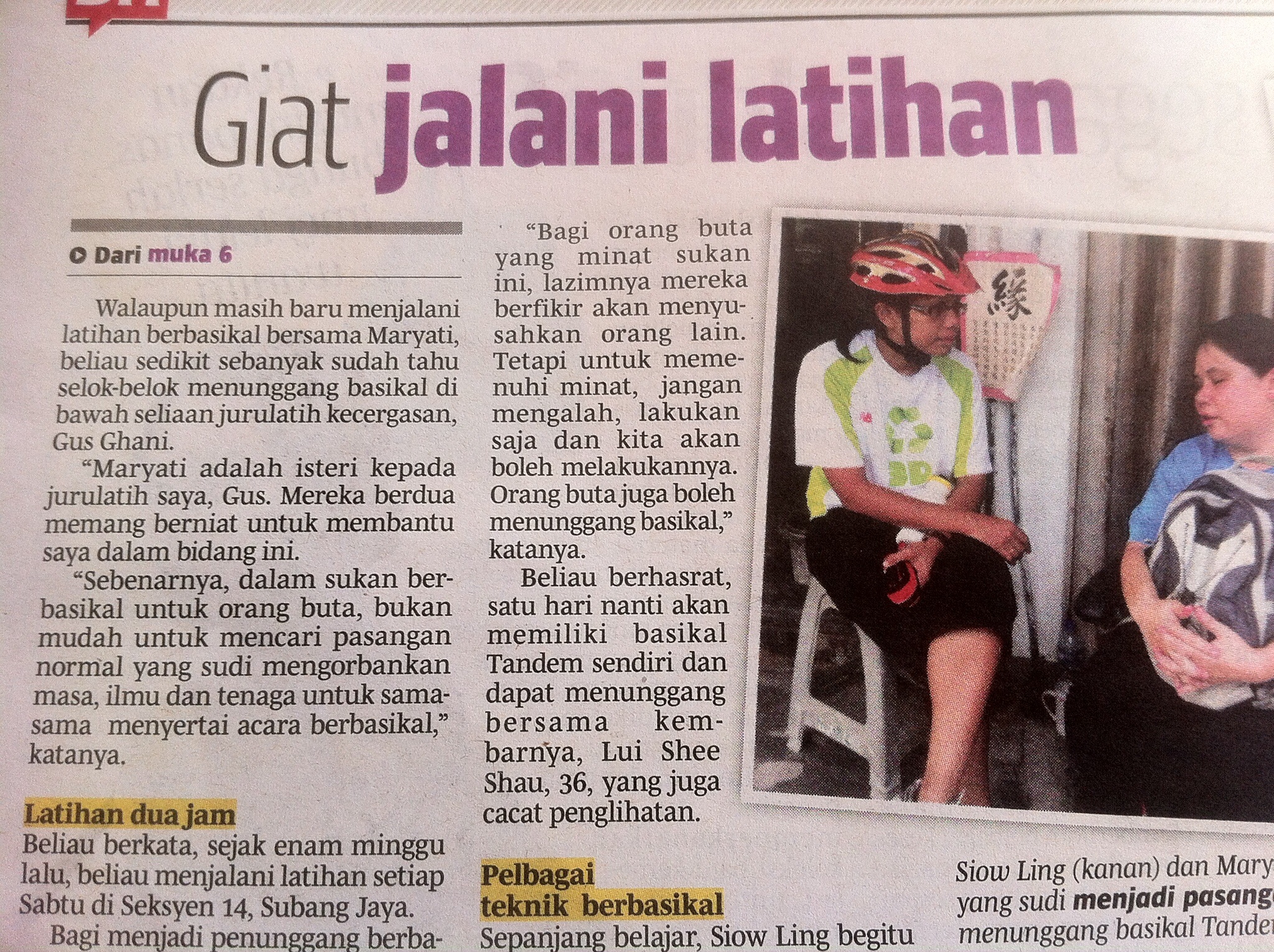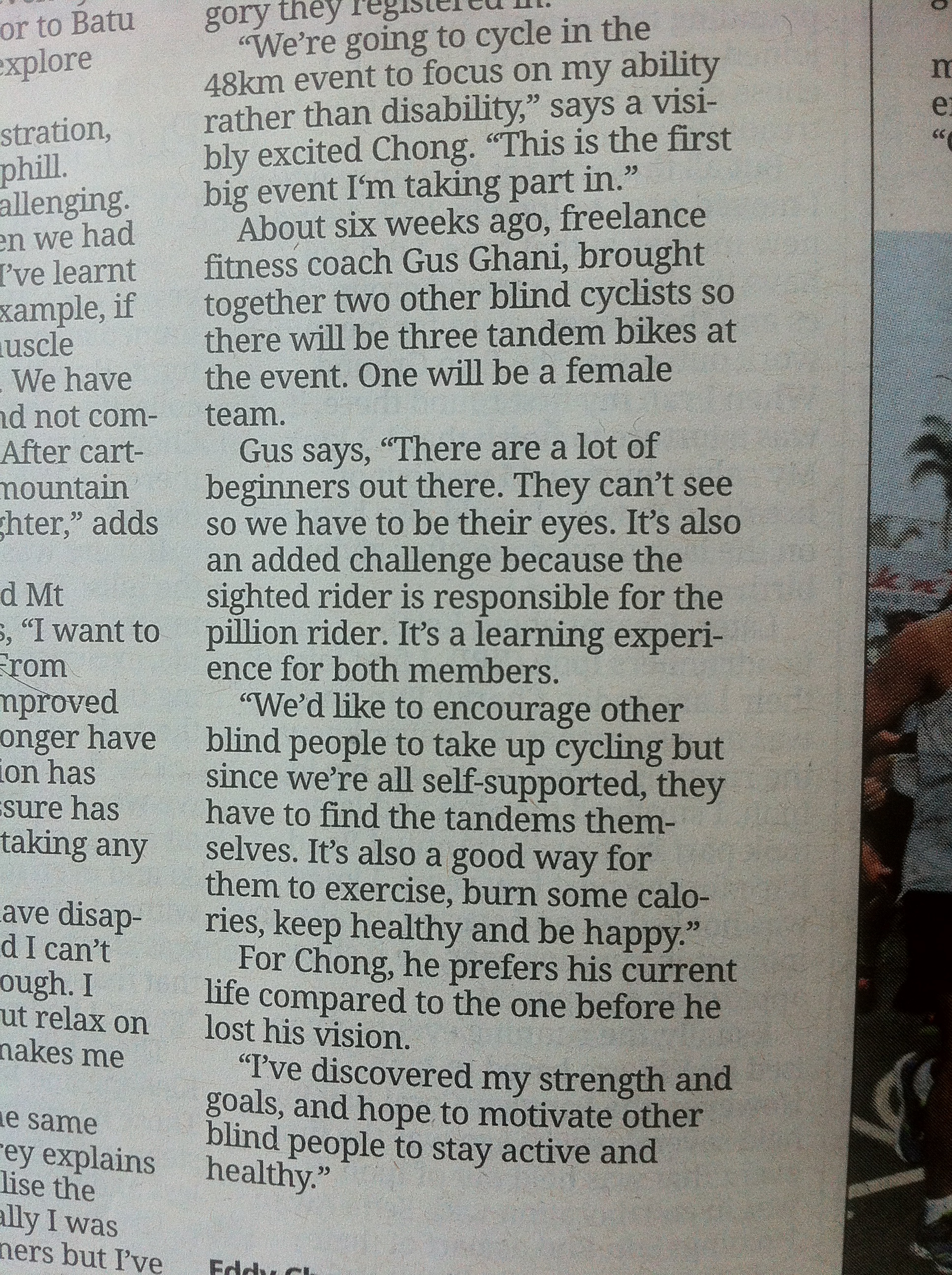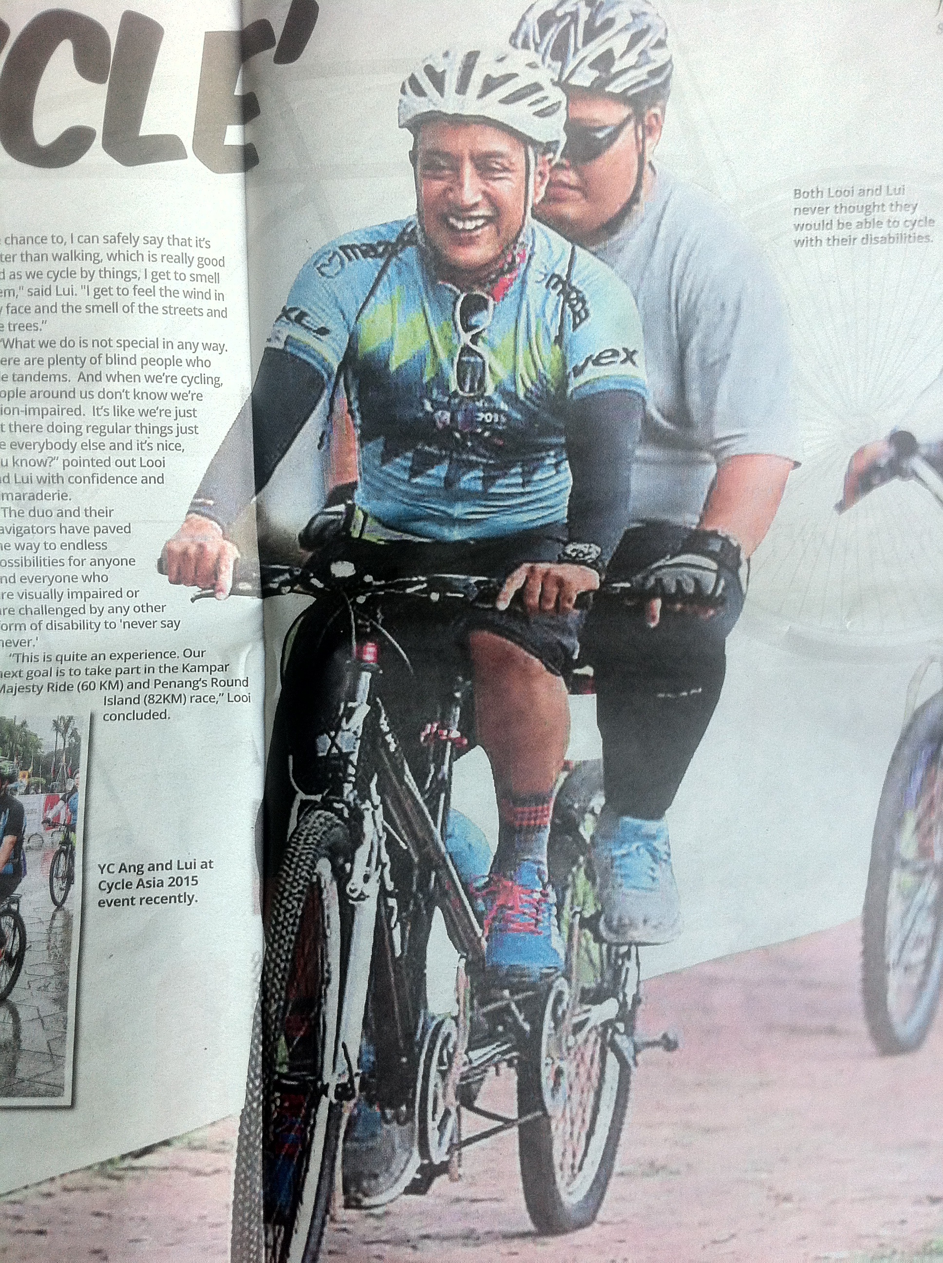 Furthermore, as a result of my stint as a navigator for a group of blind tandem cyclists, I have appeared in Berita Harian’s “Semangat Si Butah” of 1st June 2015,