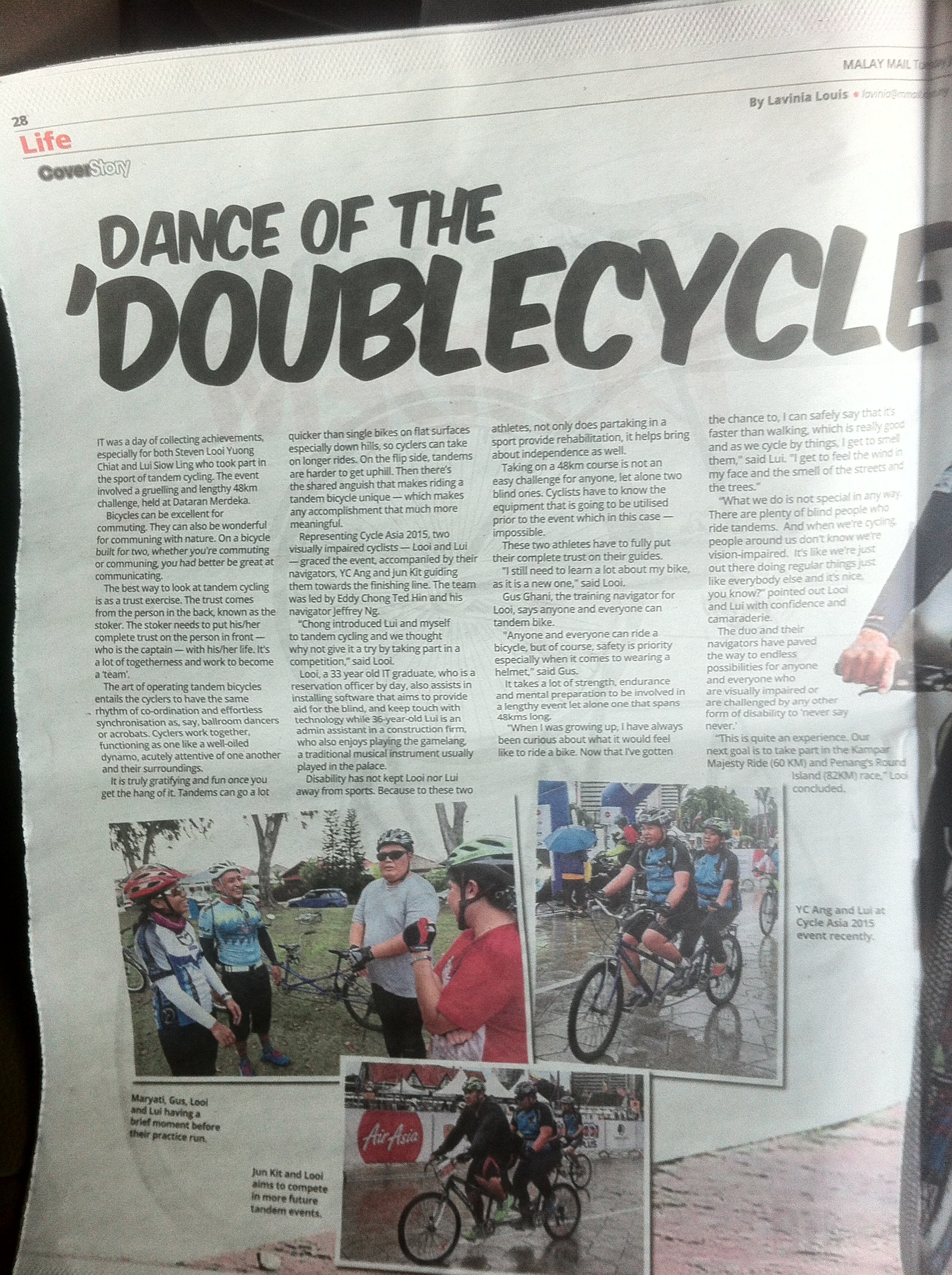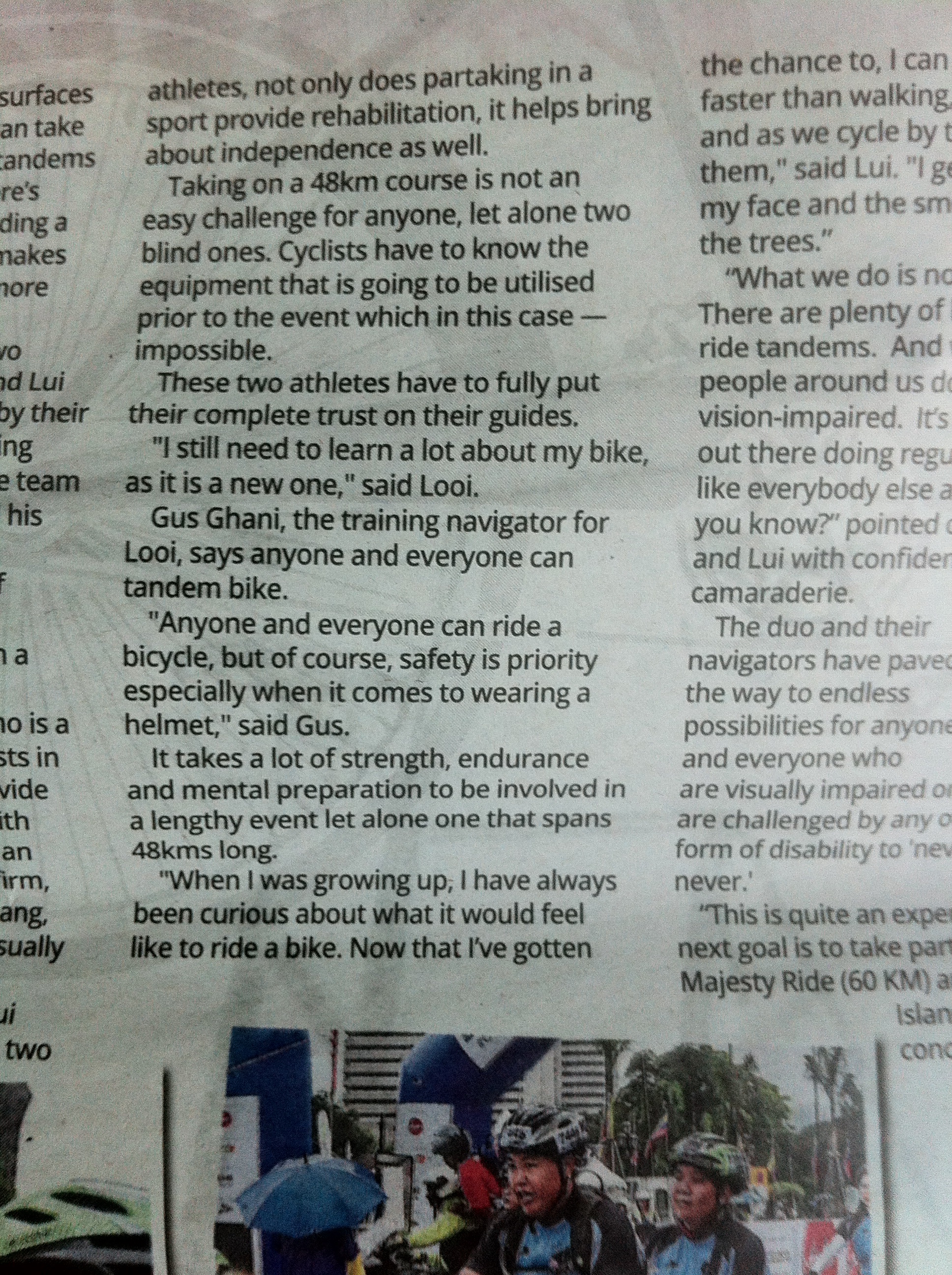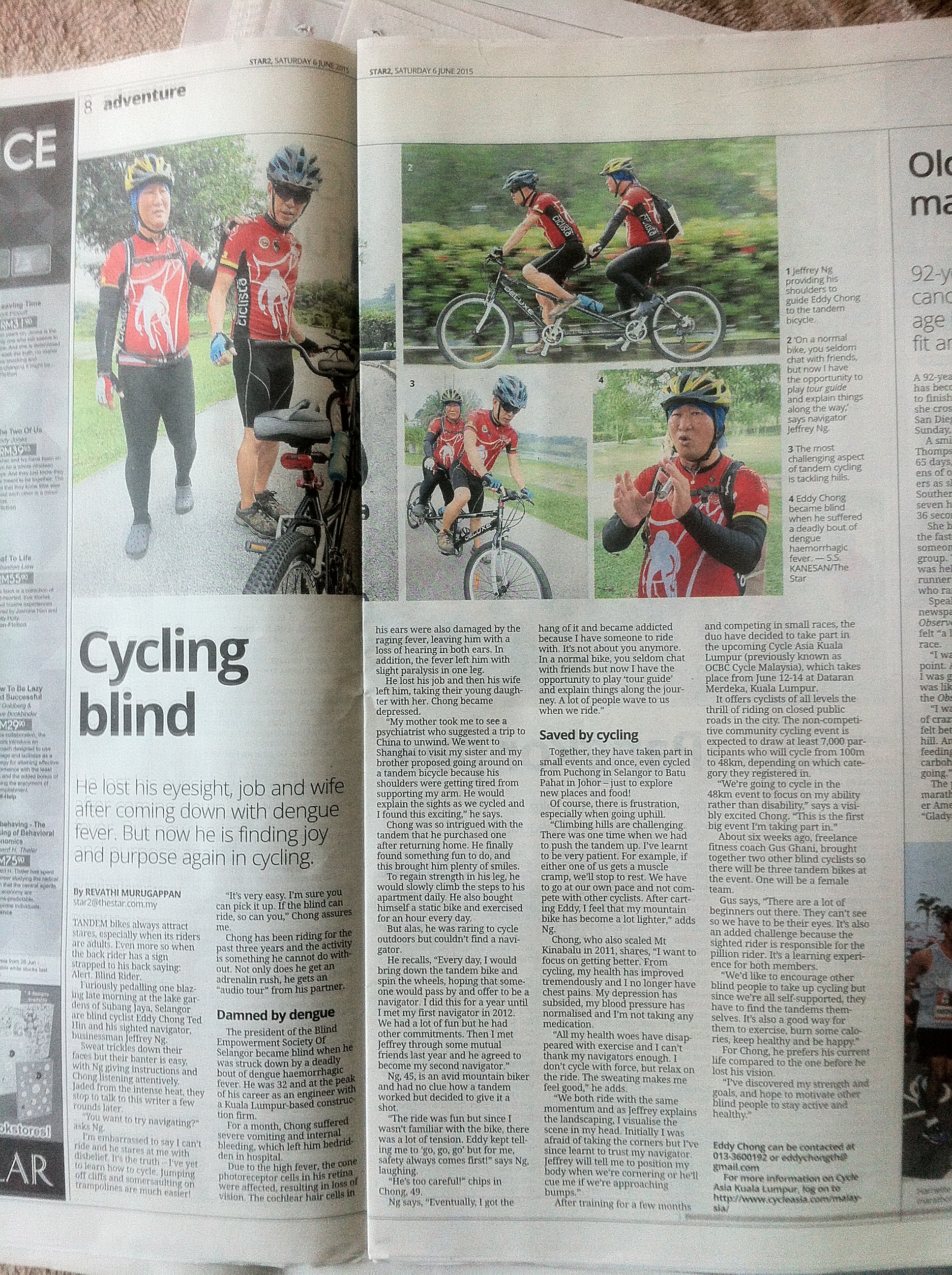 Furthermore, as a result of my stint as a navigator for a group of blind tandem cyclists, I have appeared in Berita Harian’s “Semangat Si Butah” of 1st June 2015,