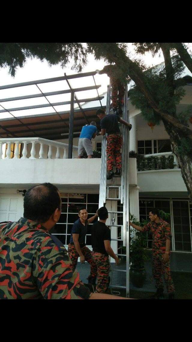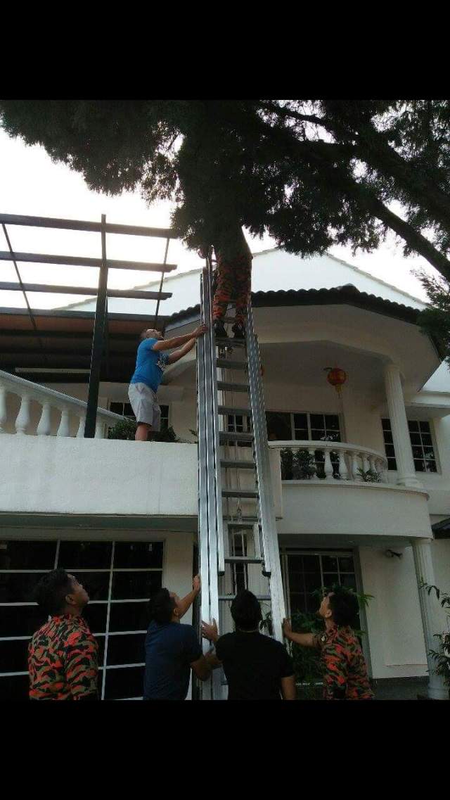 The second rescue attempt involved another fireman climbing up their own long ladder. It was a tense moment, watching the fireman reaching for the nervous Pisho. Will Pisho jump? By this time, several neighbours were witnessing the whole drama unfold like a bad reality TV episode.